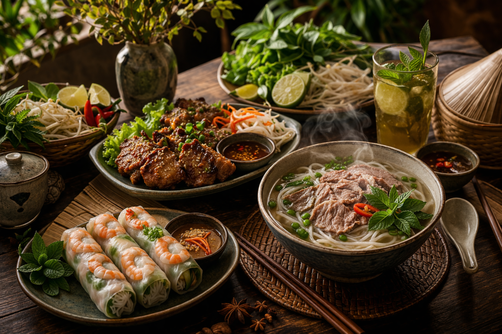 Among the must-try dishes, Pho holds a central position. This traditional soup, made with fragrant broth, rice noodles, and fresh herbs, is a true symbol of Vietnamese cuisine. Added to this are the fresh, light, and delicate spring rolls, as well as the flavorful grilled specialties.